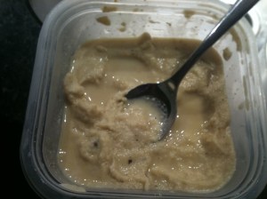 Churn with your ice cream maker or ice cream maker attachment. We have a Kitchenaid stand mixer and an ice cream maker attachment. I followed those instructions–I froze the bowl overnight before and churned on the “stir” setting for 25 mins. It probably still needs some freezing–so put in the freezer for at least 20 mins after that. And then enjoy!