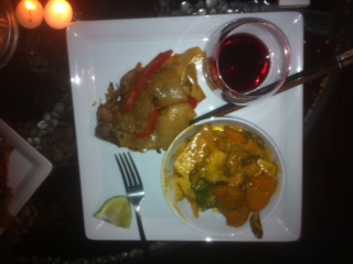 The food was extremely tasty, the presentation flawless, and the ambiance and company, perfect. The noodles were perfectly flavored (sesame oil and fresh peppercorns were key contributors) as was the crispy eggplant. And the curry…mmm…This one we will be trying to replicate. And we came home armed with some Kefir Lime leaves…so we will be able to!