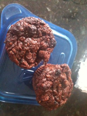 Shred up the apple & zucchini.  Mix up the egg, oil, and syrup in a bowl.  Mix up the dry ingredients in another…add the wet ingredients to the dry ingredients and mix. Add in the raisins and walnuts. Place the liners in the pan and fill them with about 1 big spoon of batter. Bake at 350 for about 15 minutes.  Test with a knife to see when it’s ready. Allow them to cool & eat!