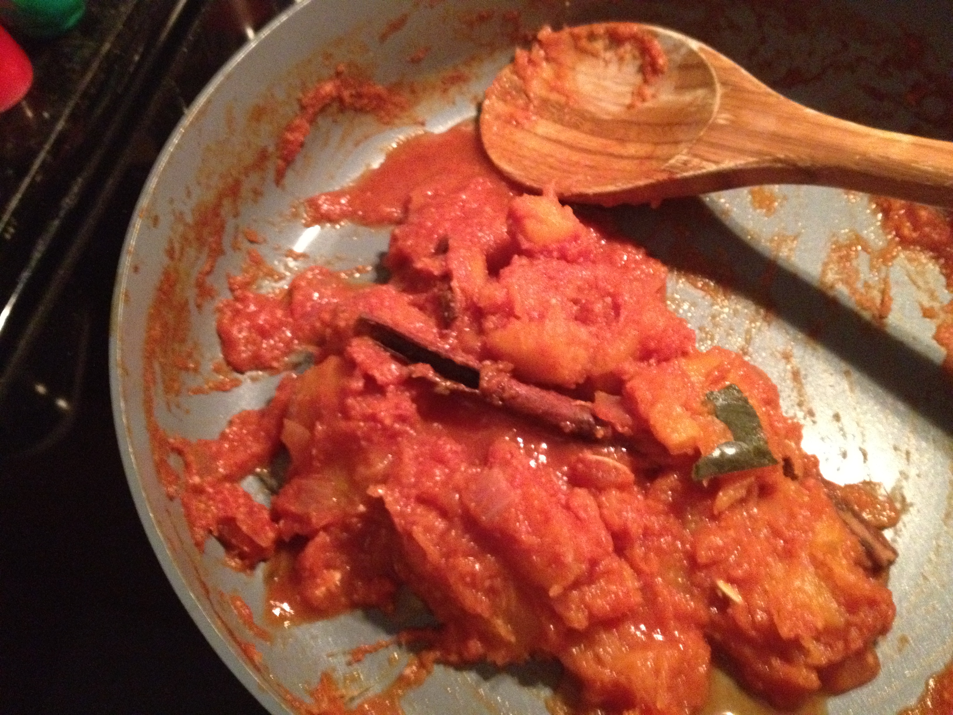 2. In a heavy bottomed skillet, saute onion in some olive oil. Add garlic, ginger, tomato paste, jalapeno, sugar, water, sriracha, and cinnamon stick. Simmer while the pumpkin is cooking. The longer it simmers, the more flavorful it gets. Chop the cooked squash into pieces and add that to the tomato mixture. Simmer for a little while longer.