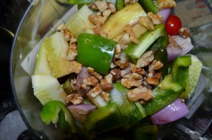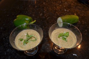 It’s been really hot, so…cold soup sounded good. We had some tomatoes and some tomatillos, several cucumbers and green peppers from our farm box…and voila…gazpacho!