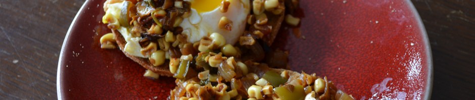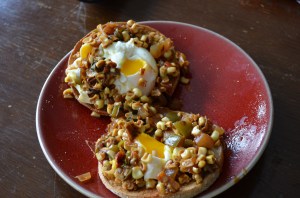 I was inspired by huevos rancheros…or at least the flavors of that dish. I didn’t really know what I was making when I started out–we had corn, peppers, and onions in the fridge…as well as some eggies… out came this tasty brunch: