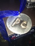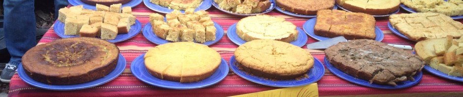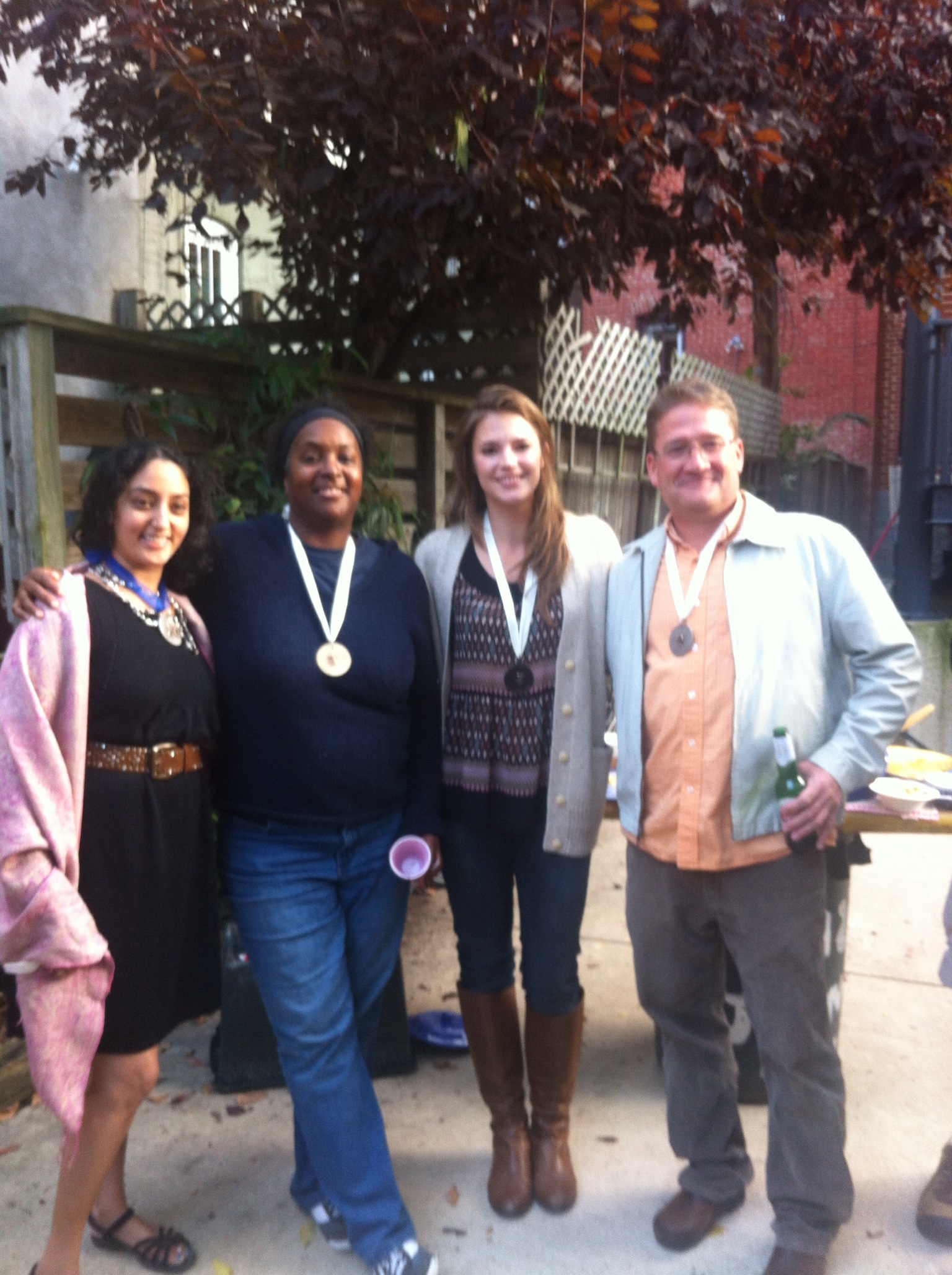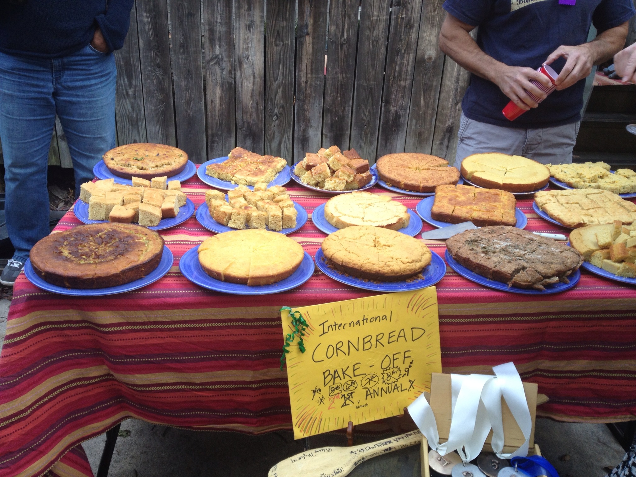 I won an award at a neighborhood cornbread bake-off today. The whole thing was just a lot of fun…a bunch of neighbors getting together to eat good food, enjoy a crisp fall day outside, and compete over…cornbread! It’s apparently a 9-year tradition that we just got in on after meeting some local artists (one is the head judge and prize maker and the other a baker who had a necklace full of prizes and whom I edged out by a coin toss). The judging was in 2 categories “traditional” (mine had too many new-fangled ingredients to make it in this category) and “peoples choice”, where everyone votes…by dropping a jelly bean on top of the plate they like. There were 15 cornbreads in contention. Until the last second, mine had 8 jellybeans and the longtime winner had 9. Then someone evened it out (yay), and to break the tie, we did a coin toss, that I just happened to win. so…I won a very nice  medal!