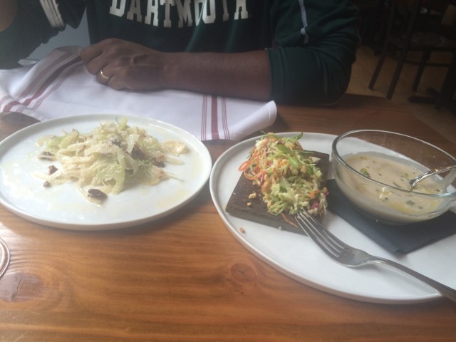 - Vinland a locavore, small plates restaurant–food is 100% from nearby areas. No olives so ghee it is. no wheat–it doesn’t grow around here, but oats do and their oat parsnip bread and oat polenta are tasty. Great slow cooked sunchokes and mushrooms. Tasty chilled turnip soup.