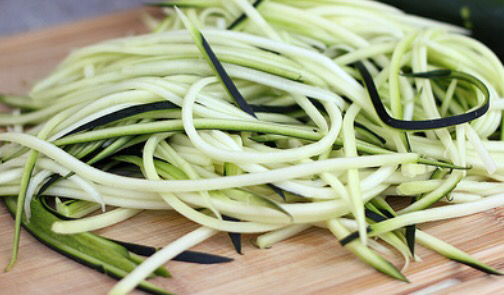 - Use a veggie noodle tool, or just a simple peeler to peel zucchini into thin strips. Put into a big bowl